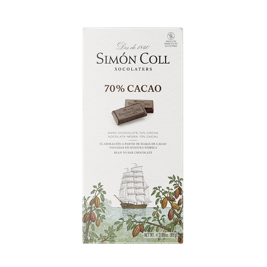 Fórmula 70% cacao. Elaborado con ingredientes naturales de gran calidad y fabricado siguiendo el proceso de selección y tostado tradicional del grano en nuestra fábrica Simón Coll. Ideal para los amantes de los sabores intensos y de los altos porcentajes de cacao. Libre de gluten y aditivos artificiales. Se presenta en tableta de 85g fácilmente divisible para degustar y disfrutar mejor del chocolate.