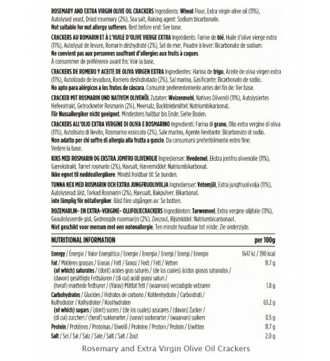Harina de trigo, aceite de oliva virgen extra (11%), levadura autolizada, romero deshidratado (2%), sal marina, gasificantes: bicarbonato sódico.