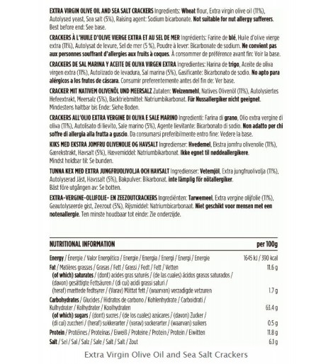 Harina de trigo, aceite de oliva virgen extra (11%), levadura autolizada, sal marina (5%), gasificante: bicarbonato sódico.