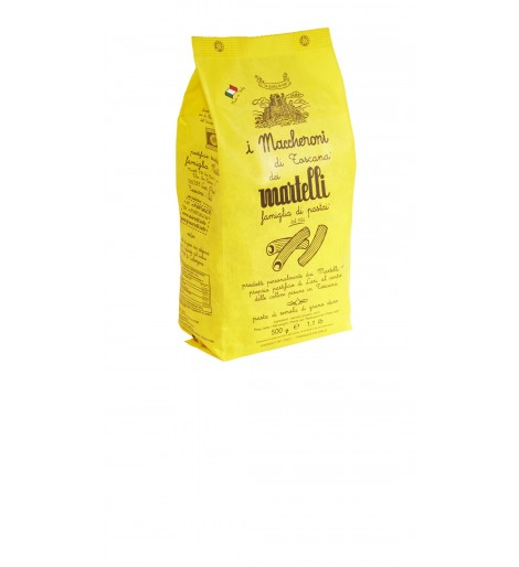 La letra de los envases parece imitar la bella caligrafía infantil sobre un fondo amarillo trigo: un guiño al buen hacer de esta empresa toscana, creada en 1926. Siete miembros de una misma familia logran el tesoro de unas pastas exquisitas, de elaboración tradicional y esmerada. El corte se hace en moldes de bronce y el proceso de secado es lento y paciente.