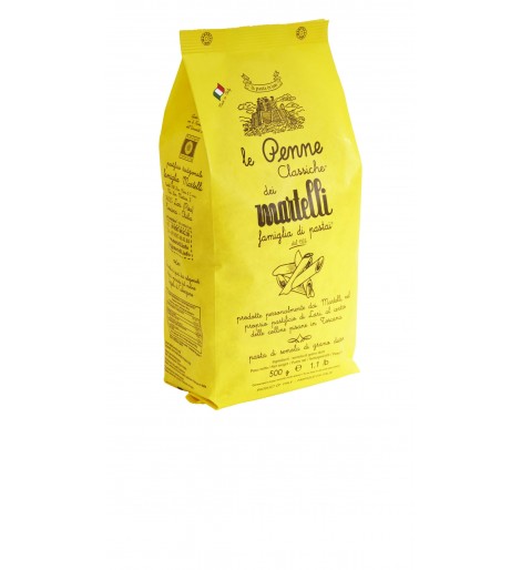 La letra de los envases parece imitar la bella caligrafía infantil sobre un fondo amarillo trigo: un guiño al buen hacer de esta empresa toscana, creada en 1926. Siete miembros de una misma familia logran el tesoro de unas pastas exquisitas, de elaboración tradicional y esmerada. El corte se hace en moldes de bronce y el proceso de secado es lento y paciente.